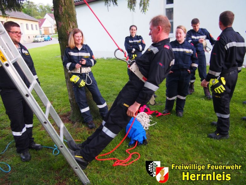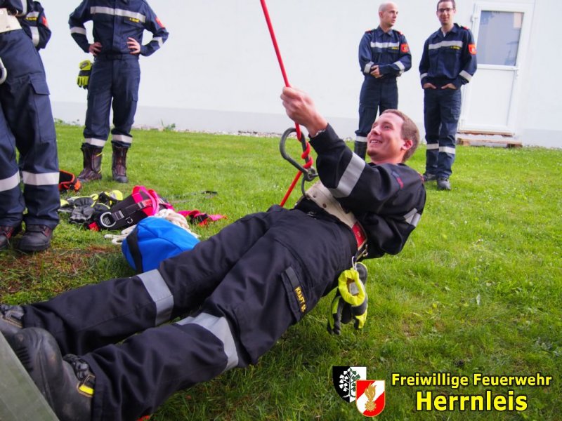 Dabei wurde auch der Unterschied zwischen "aktives Arbeiten" (Feuerwehrmitglied sichert sich selbst) und "passives Arbeiten" (Feuerwehrmitglied wird von anderem Mitglied gesichert) gezeigt.
