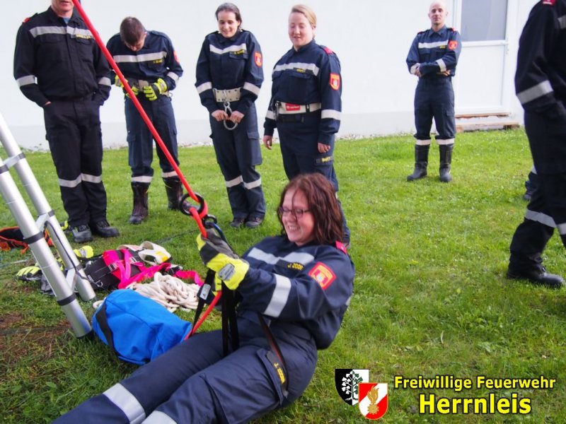Beübt wurde die Selbstrettung mit dem Feuerwehrgurt ohne Karabinersicherung, abseilen mit dem Auffanggeschirr und Abseilachter.
